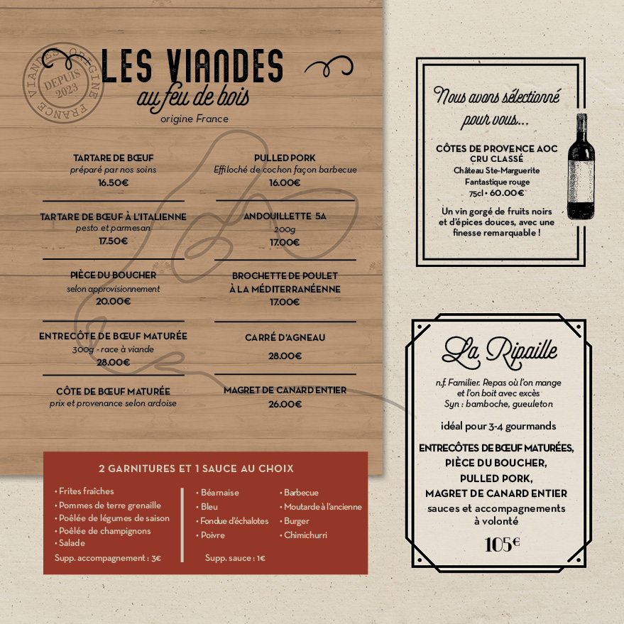 “ Je recommande fortement l'expérience de la Ripaille, c'est un beau plateau de viandes (pour 3-4 personnes) avec accompagnements et sauces à volonté. Les viandes sont de qualité et la cuisson bien maîtrisée. Nous nous y sommes mis à trois et autant vous dire que ce plateau cale bien. ”